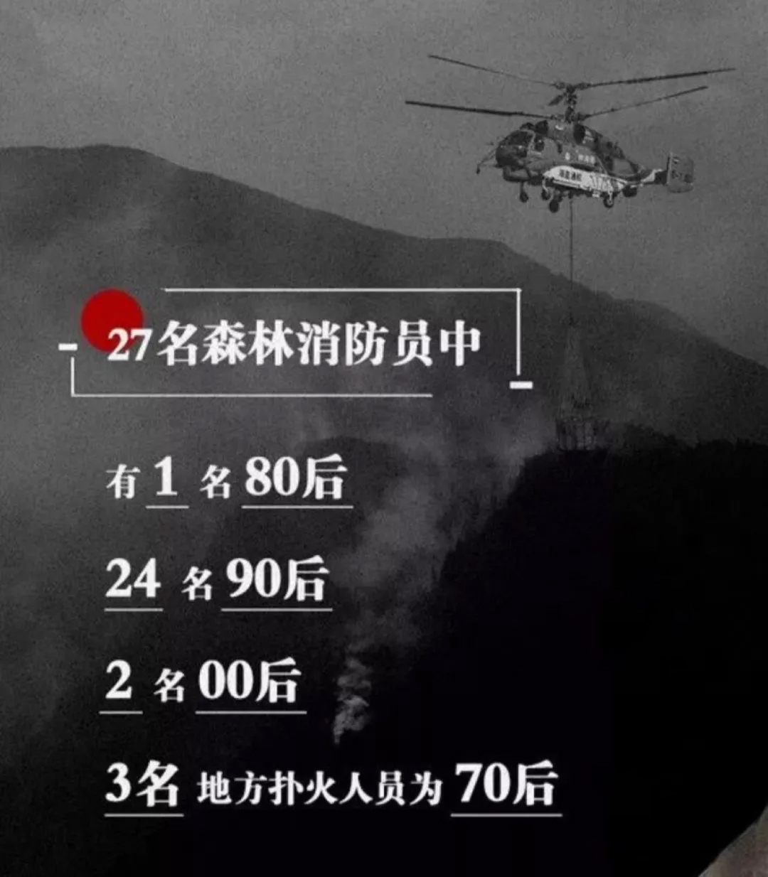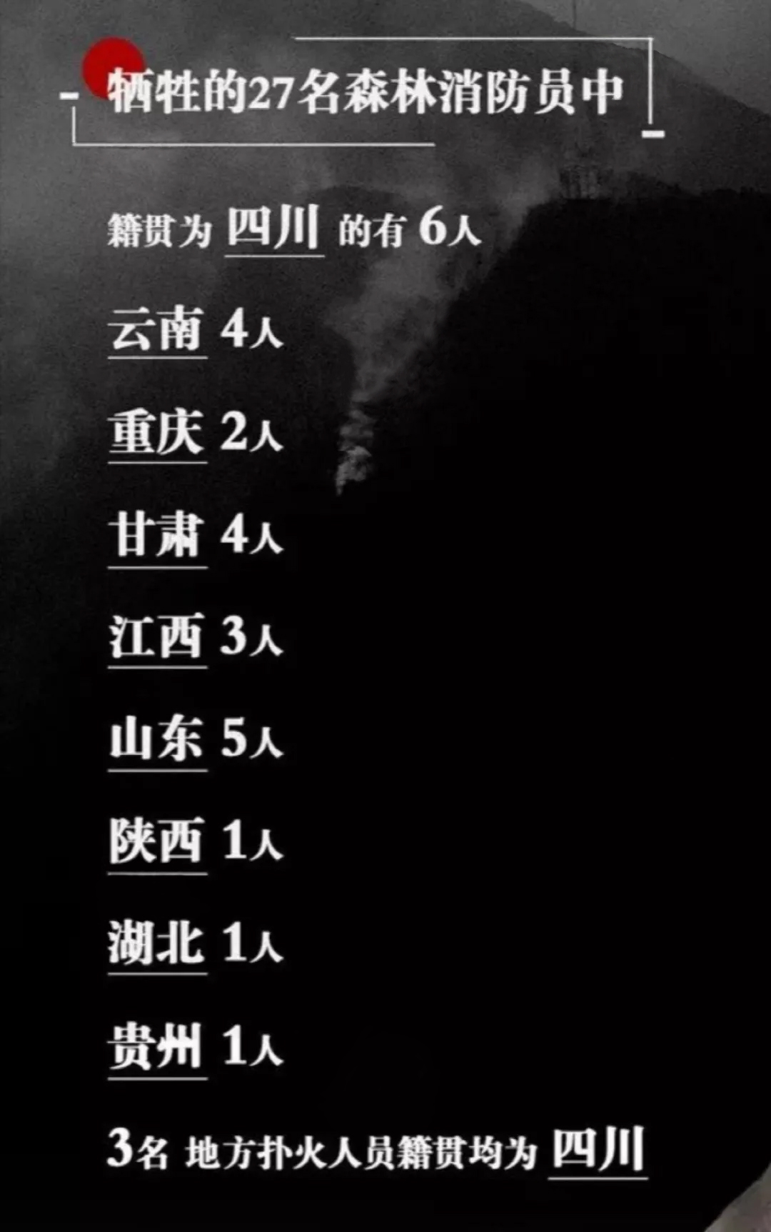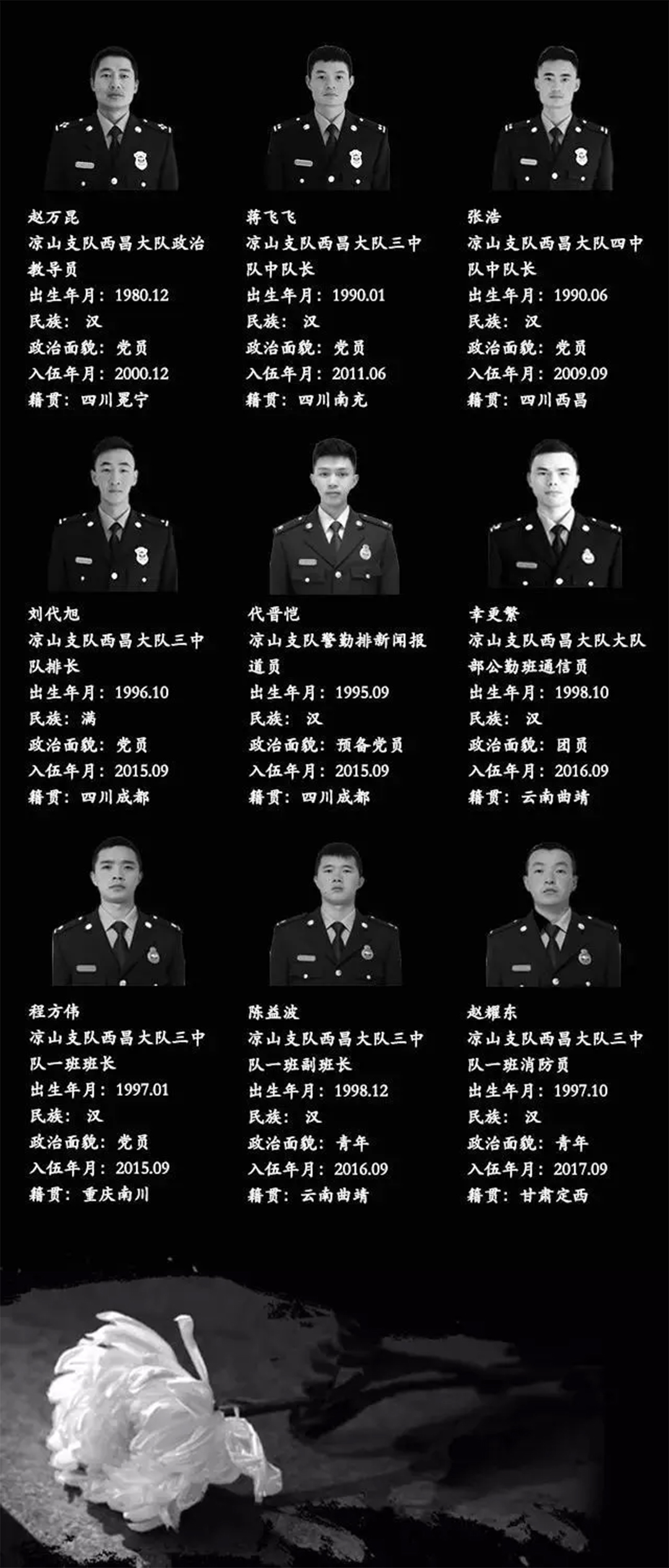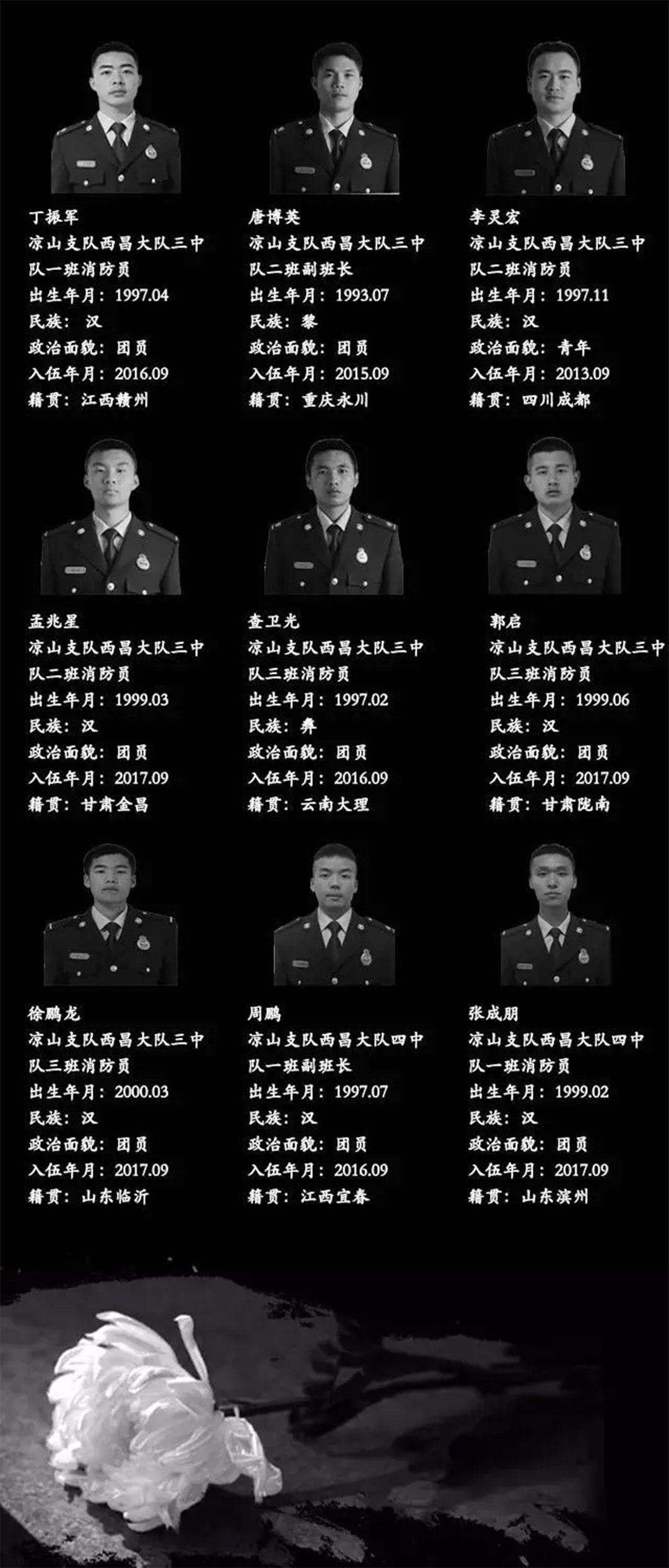 這是一場慘烈的“斗爭”,為了拯救人民財產、動植物等的犧牲,這是一份沉重的名單,經統計核實,有27名同志系涼山州森林消防支隊指戰員。27人中有干部4人、消防員23人。漢族22人、滿族1人、黎族1人、彝族2人、畬族1人。1980年后出生1人,1990年后出生24人,2000年后出生2人,年齡最小為2000年7月出生。中共黨員9人(含預備黨員1人),共青團員11人,青年7人。