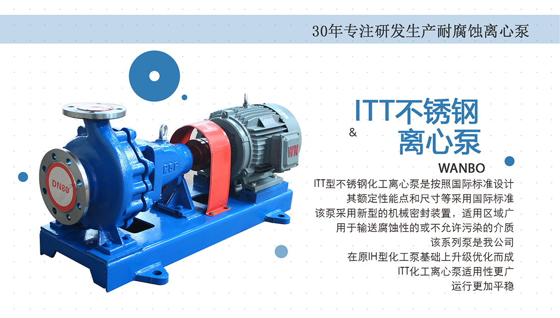 設計特點:ITT型不銹鋼化工離心泵是按照國際標準設計,其額定性能點和尺寸等采用國際標準,用于輸送腐蝕性的或不允許污染的介質,該系列泵是我公司在原IH型化工泵基礎上升級優化而成,ITT化工離心泵適用性更廣,運行更加平穩。用途:適用于化工、石油、冶金、電力、造紙、食品、制藥、環保、廢水處理和合成纖維等行業用于輸送各種腐蝕的或不允許污染的類似于水的介質。流量范圍:12.5T/h-100T/h,揚程范圍:20m-60m,功率范圍:2.2kw-18.5kw,運行溫度:-20℃—150℃??筛鶕嶋H工況要求變更配置。